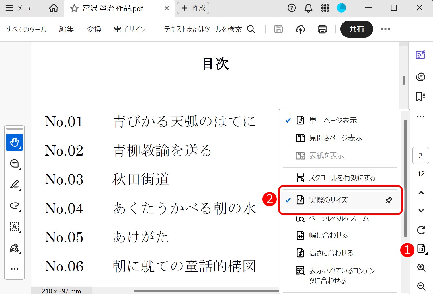 Adobe Acrobatには、PDFを100%の倍率で表示する方法が用意されています。現在のAcrobatでは、この100%表示が「実際のサイズ」という名称でメニューに表示されます。