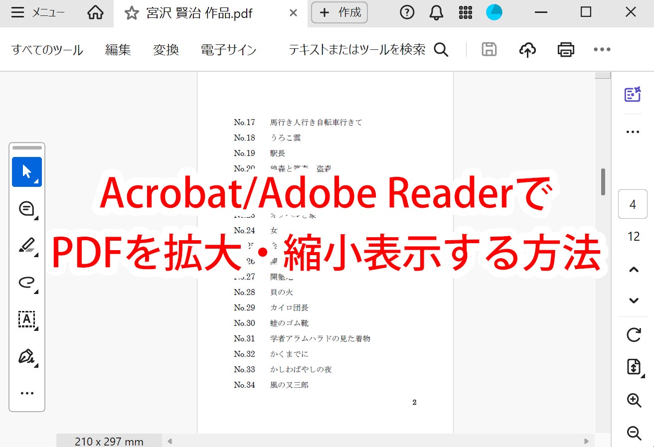 Acrobatのメニューにある「実際のサイズ」は、PDFを100%の倍率(原寸表示)で表示するモードです。実際のサイズで見たい時に指定する倍率で、拡大しすぎた・文字が小さい時なに画面を一気にリセットできます。