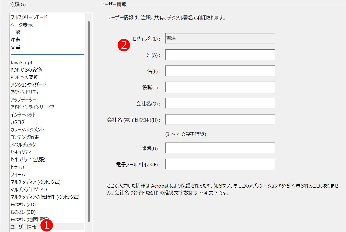 現在のAcrobat/Readerでは、ユーザー情報の欄に名前を書いても、注釈の作成者名には反映されません。作成者名はあくまで次の2つで決まります。