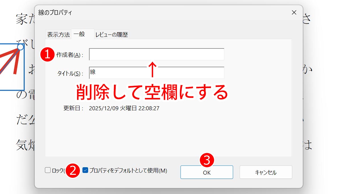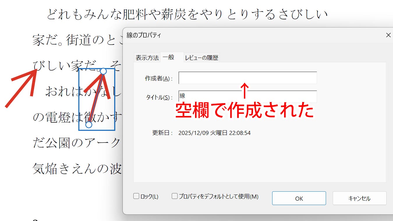 この後に、矢印の注釈プロパティの作成者の欄を見ると、名前が消えていることが確認できます。
