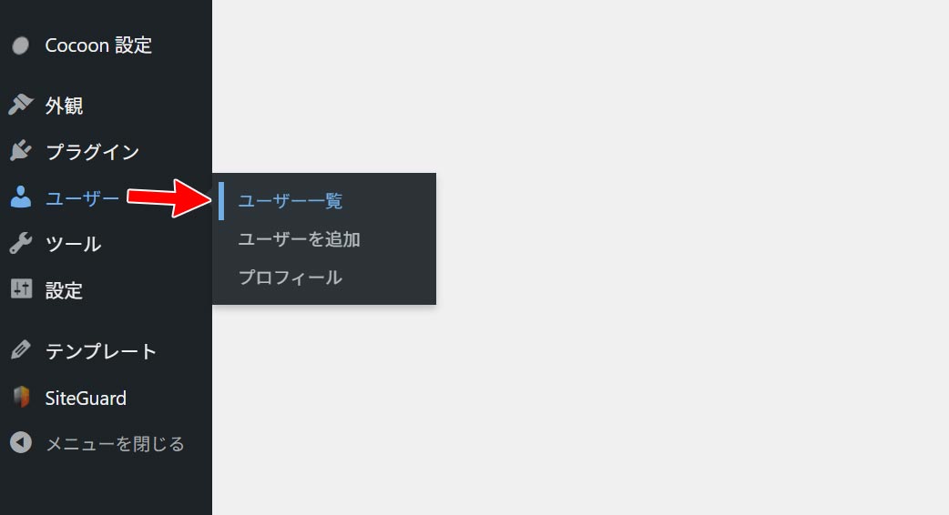 WordPressの管理画面から「ユーザー」→「ユーザー一覧」を選択します。