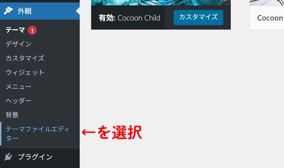WordPressの管理画面から「外見」→「テーマファイルエディター」を選択します。