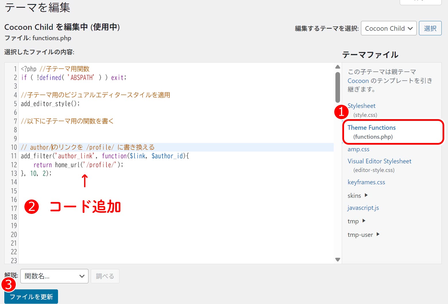 ① 「Theme Functions (functions.php)」をクリック