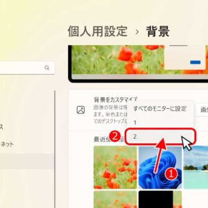 デスクトップ2の上で、(1)「マウスの右ボタン」をクリックし、(2)「背景の選択」をクリックします。